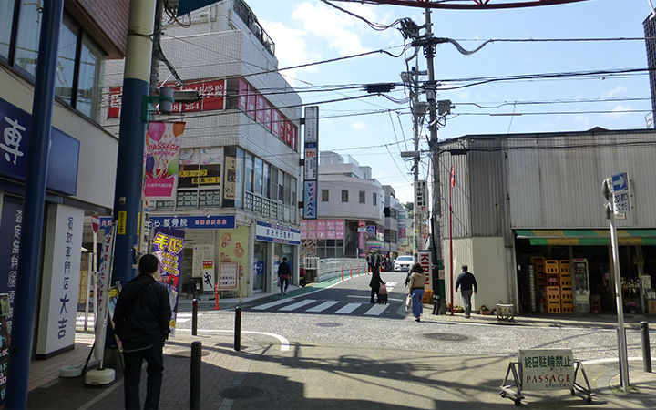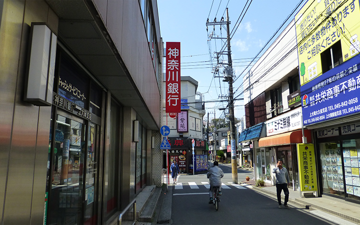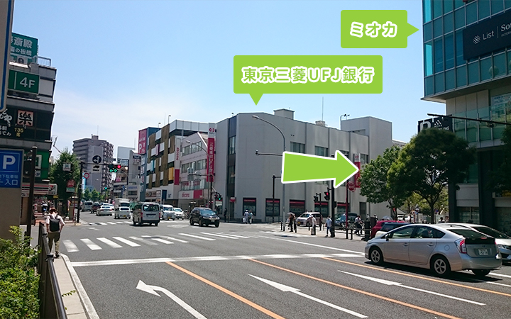 1. 鎌倉街道からお越しの方は、東京三菱UFJ銀行とミオカという商業施設の間の道からお入りください。