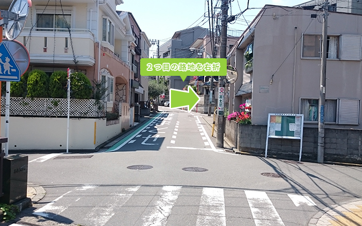 2. 直進し十字路を過ぎて橋を渡ったら、2つ目の路地を右折して下さい。